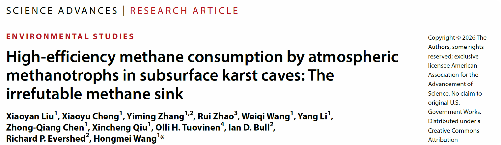(通讯员刘邓、马丽媛 编辑申墁烨)2月5日,我院王红梅教授团队联合我校地质微生物与环境全国重点实验室,与美国麻省理工学院、俄亥俄州立大学及英国布里斯托大学等单位合作,在《科学进展》(Science Advances)发表研究成果。该研究综合运用微宇宙培养、稳定同位素示踪及多组学技术,首次系统揭示了喀斯特洞穴中大气甲烷被高效氧化的微生物驱动机制,证实了地下喀斯特生境是一个此前被严重低估的大气甲烷汇。这一发现深化了对陆地生态系统甲烷循环过程的认识,为更准确评估全球甲烷收支提供了科学依据。