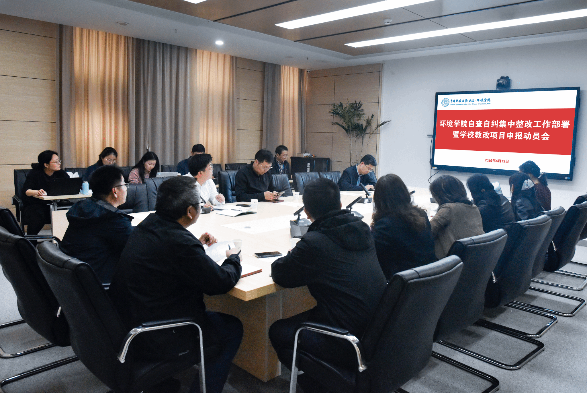 (通讯员/摄影王孟雪 编辑申墁烨)4月13日下午,环境学院自查自纠集中整改工作部署暨教改项目申报培训动员会在科教楼四308会议室召开。学院党政领导班子成员,三级单位党支部书记、主任、分管教学副主任、基层教学组织负责人参加会议。学院党委副书记丁继国主持自查自纠集中整改工作部署会。