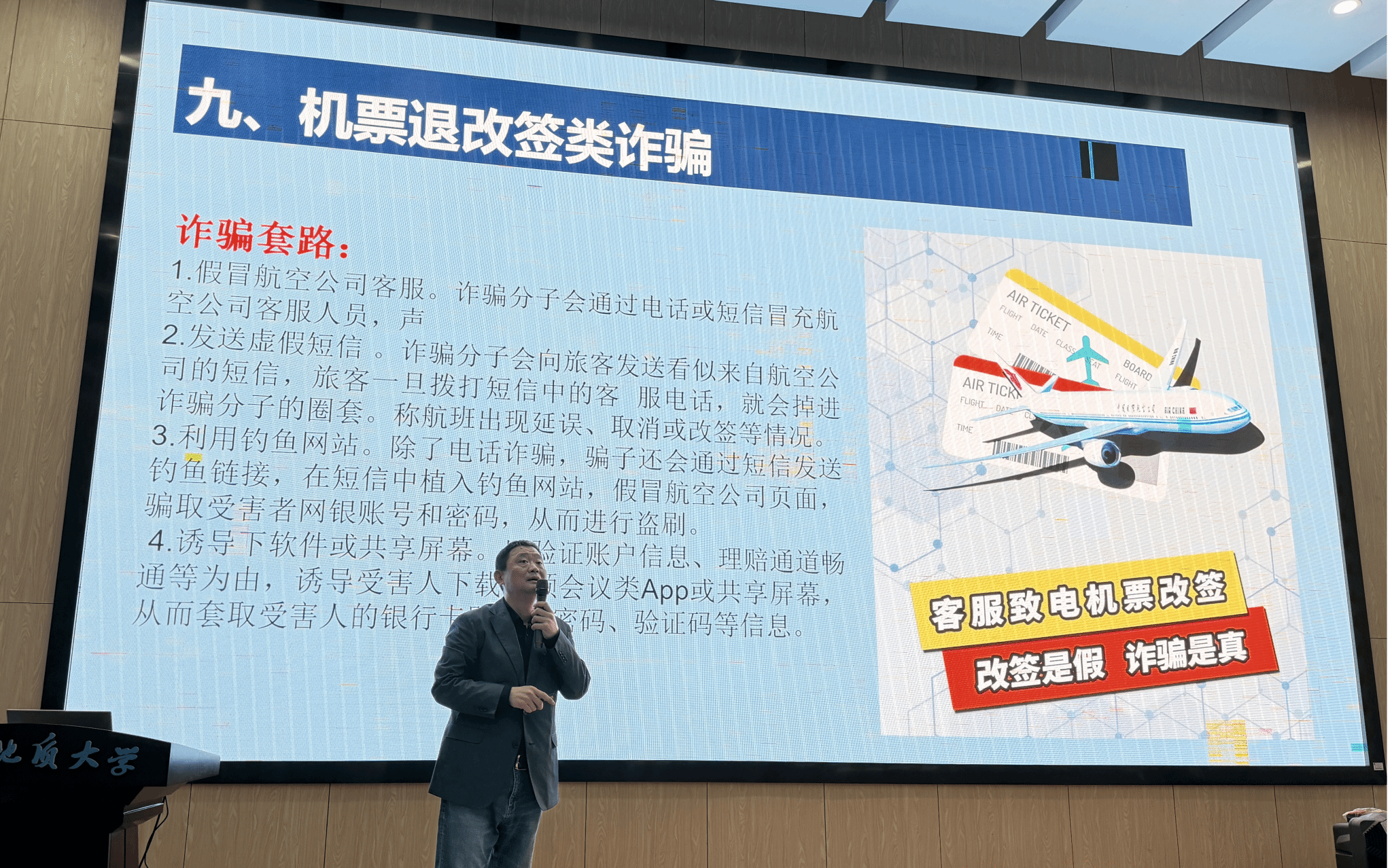 张献文作主题为“安全警示”安全教育培训。他介绍学校电信网络诈骗、消防、治安以及网络安全的形势及分布情况。他援引真实案例,详细剖析电信网络诈骗常见手法,包括网络刷单、兼职诈骗、冒充好友亲属、冒充公检法、个人征信诈骗、游戏账号交易、演唱会门票交易、机票退改签、网络平台交友等。他提醒同学们采取“不轻信、不转账、多核实”的防诈原则,共同筑牢网络安全防线。
